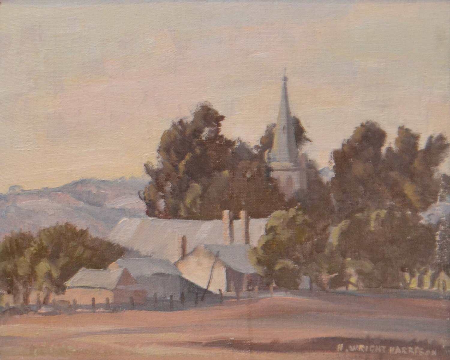 H. WRIGHT HARRISON, LANDSCAPE WITH CHURCH, OIL ON CANVASBOARD, 24.5 X 29CM