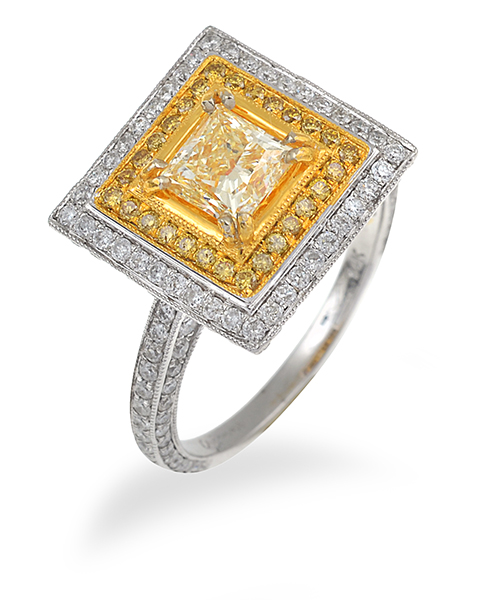 Centrally set with a princess cut fancy yellow diamond of 1.01cts, surrounded by a row of yellow and row of white round brilliant cut diamonds, mounted in 14ct white gold, ring size N.