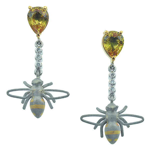 Each set with a pear cut yellow sapphire with round brilliant cut diamonds and a brushed finish two tone gold bee suspended below, mounted in 18ct gold, designed by Ewen Ryley.
