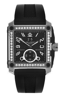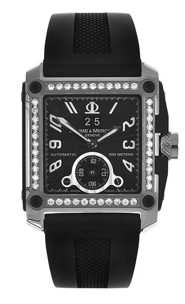 Automatic movement, square black dial with Arabic numerals, dual time zone dial at six, date aperture at twelve, signed case, dial and movement, stainless steel case with diamond set bezel and black neoprene bands, 30mm diameter.