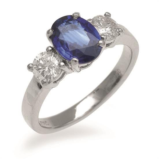 The oval cut sapphire of 1.94cts, flanked by two round brilliant cut diamonds totalling 0.82cts, all set in platinum, ring size O.