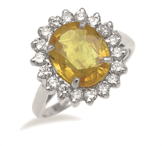 A YELLOW SAPPHIRE AND DIAMOND CLUSTER RING