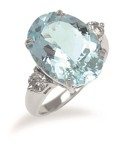 Centrally set with an oval cut aquamarine of 8.10cts, flanked by two round brilliant cut diamonds totalling 0.40cts, mounted in 18ct white gold, ring size M.