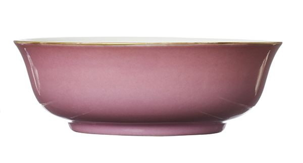 The body with exterior pink glaze and gilt lined everted rim, 13.5cm diameter.