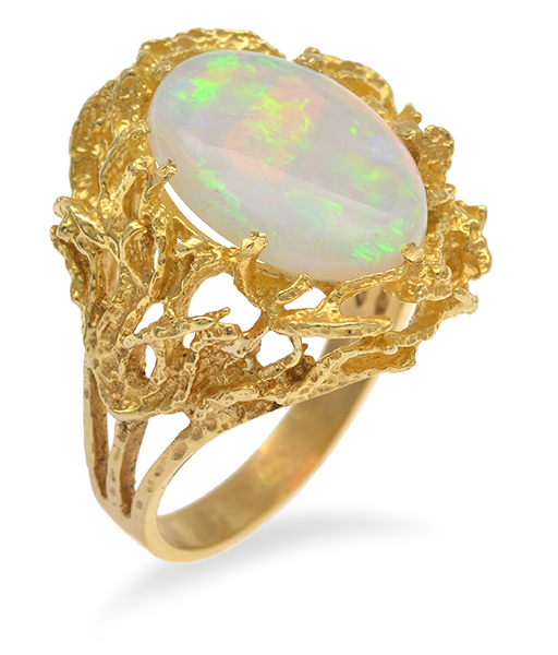 The oval solid opal cut en cabochon, set in a textured frame of 18ct gold, ring size N.