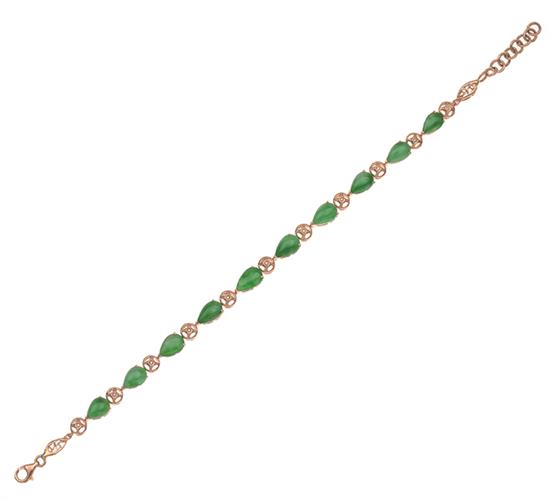Set with tear shaped jadeite cut en cabochon, interspaced with single cut diamonds, mounted in 18ct rose gold, total length 190mm.