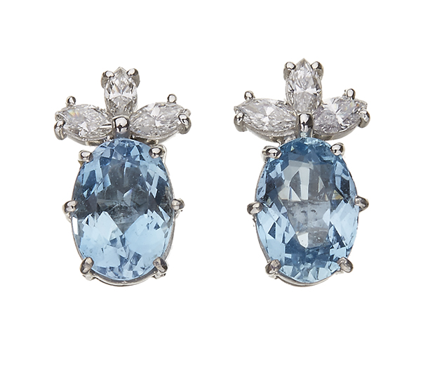Each oval cut aquamarine claw set to a marquise cut diamond set surmount, mounted in 18ct white gold, to screw back fittings.