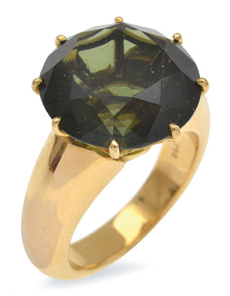The round green tourmaline of 13.25cts, mounted in a heavy band of 18ct gold, ring size O.