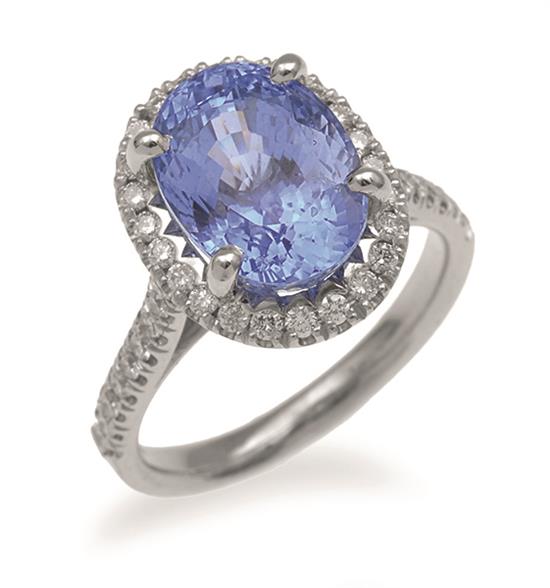 The oval cut sapphire of 6.64cts, surrounded by round brilliant cut diamonds totalling 0.49cts, mounted in 18ct white gold, ring size M.