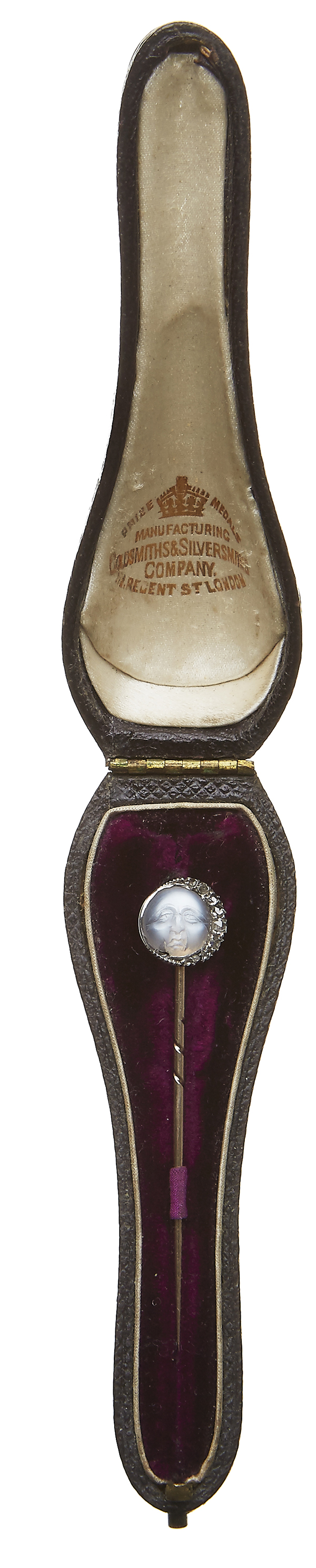 Depicting Man of the Moon, with rose cut diamond crescent, accompanied by fitted case.