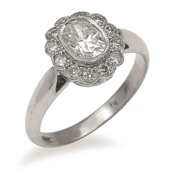 Centrally set with an oval cut diamond of 0.90cts, surrounded by twelve old cut diamonds totalling 0.24cts, mounted in 18ct white gold, ring size O.