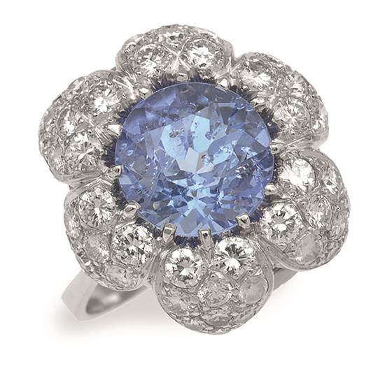 Centrally set with a round Ceylon sapphire of 4.86cts amongst diamond set petals, mounted in 18ct white gold, ring size P.