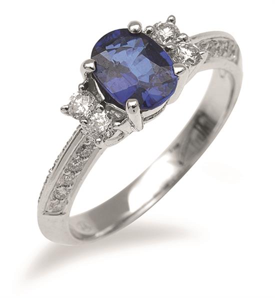 The oval cut sapphire of 1.23cts, set with diamond detail throughout totalling 0.38cts, mounted in 18ct white gold, ring size N.