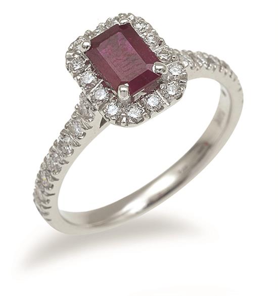 The emerald cut ruby of 0.78cts, surrounded by round brilliant cut diamonds, mounted in 18ct white gold, ring size J.