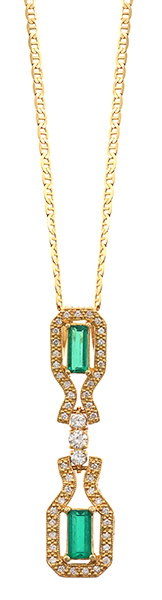 The elongated pierced pendant comprising two emerald cut emeralds totalling 1.37cts, with round brilliant cut diamonds set throughout totalling 0.33cts, suspended from a fancy flat link chain, all mounted in 18ct gold, total length 500mm.