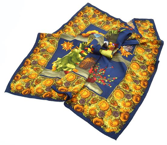 Styled with a floral theme in multi colours on a navy background, 90cm square.