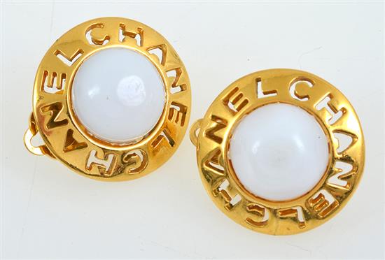 Each clip on earring styled with a central white cabochon bead, to a gold metal surround.