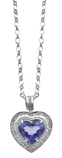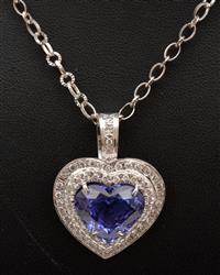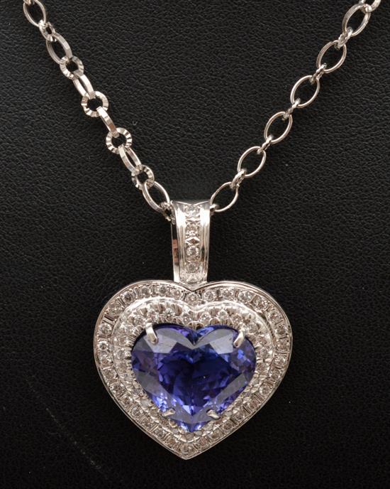 Centrally set with a heart cut tanzanite of 12.80cts, surrounded by round brilliant cut diamonds totalling 1.24cts, suspended from a fancy link chain, all mounted in 18ct white gold, total length 430mm.