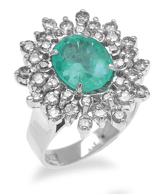 Centrally set with an oval cut emerald of 3.00cts, surrounded by single cut diamonds totalling 1.10cts, mounted in 18ct white gold, ring size N-O.