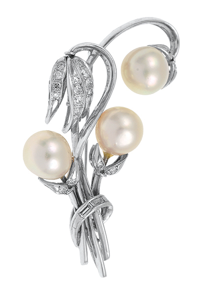 The floral spray featuring three cultured pearls measuring 8.80mm - 9.30mm, with baguette and single cut diamond detail set throughout, mounted white gold.