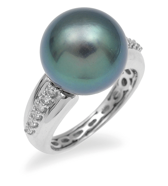 The round pearl of green grey hue measuring 13.00mm, having diamond detail to the shoulders, mounted in 18ct white gold, ring size M-N.