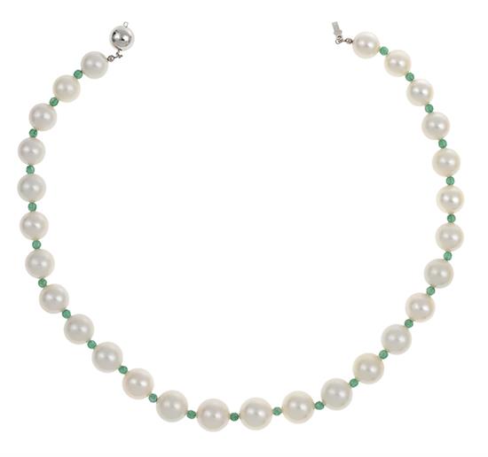 The round pearls of silver and white hue measuring 12.30mm - 14.50mm, interspaced by faceted aventurine quartz, to a 14ct white gold ball clasp, total length 470mm.