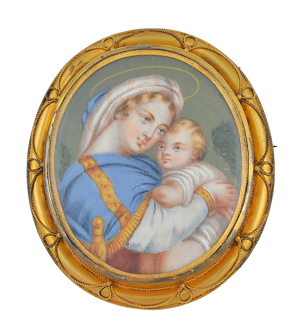 The oval ivory panel finely painted depicting a religious scene of mother and child, mounted in a gold lined frame with applied rope twist decoration.