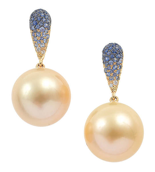 A PAIR OF GOLD SOUTH SEA PEARL, SAPPHIRE AND DIAMOND EARRINGS