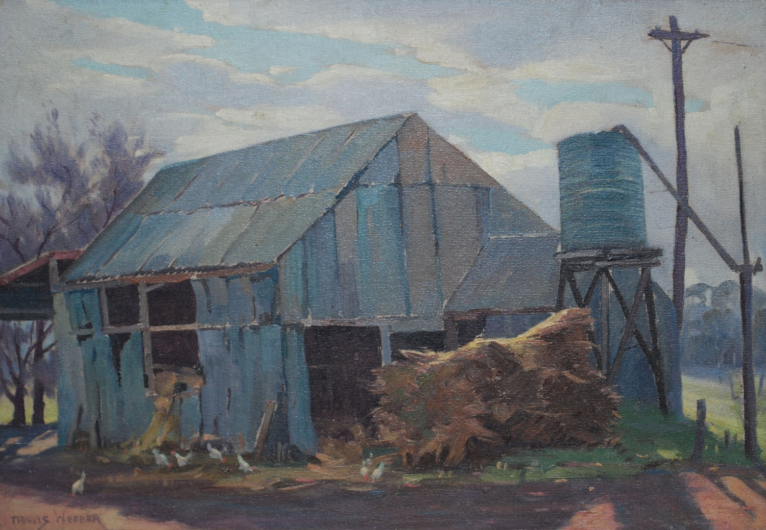 TRAVIS WEBBER (1900-1968), SHED WITH CHICKENS, OIL ON CANVASBOARD, 31 X 46CM