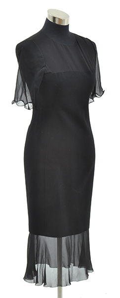 Styled in black wool and silk, with sheer sleeves and hem, labelled size 36.