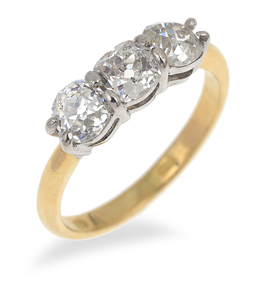 Set with three old mine cut diamonds totalling 1.60cts, mounted in 18ct gold, ring size O-P.