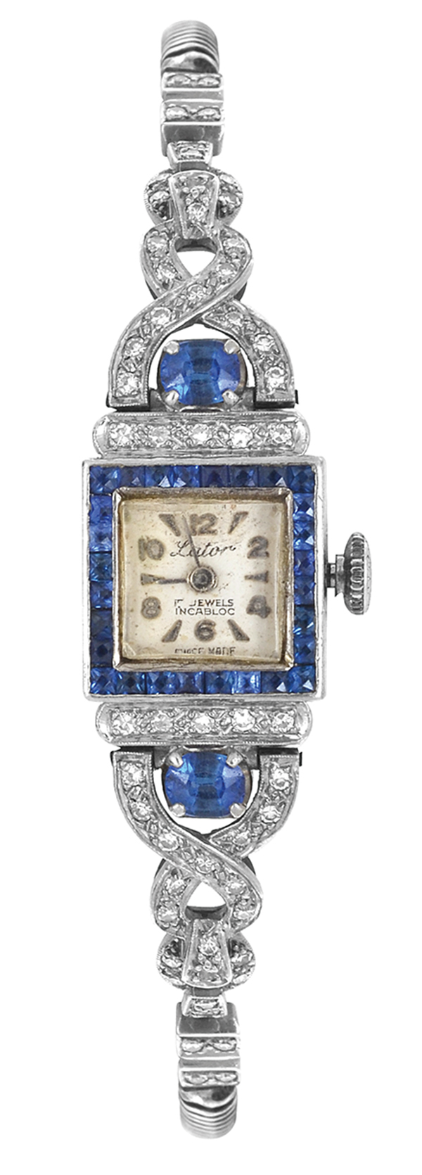 Manual wind 17 jewel movement, square dial with applied numerals, signed dial Lator, 18ct white gold case with diamond and sapphire detail to case and lugs, 14mm diameter.