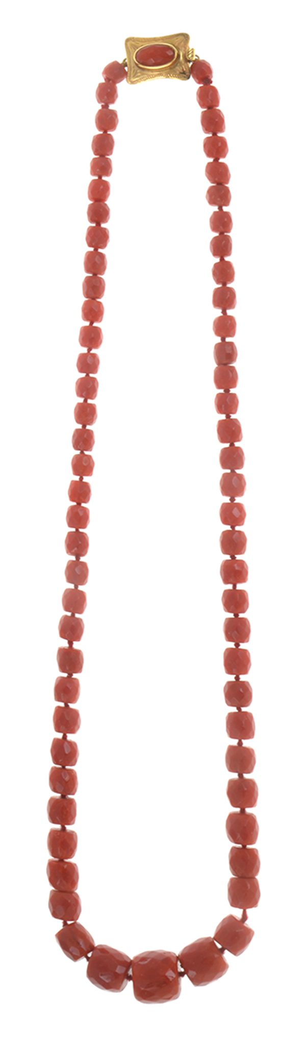 The graduated faceted coral beads finished with a tonneau shaped clasp set with an oval fancy cut coral in 14ct gold, total length 680mm.