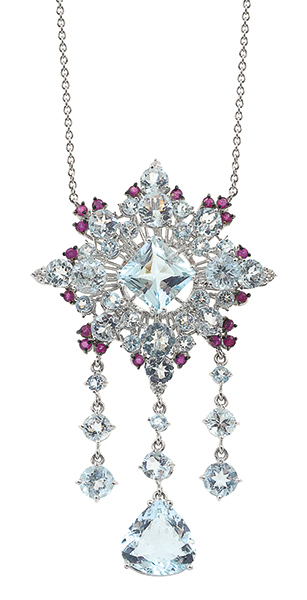 The cluster pendant with three articulated drops, set with multi faceted aquamarines, ruby and diamond highlights, to fine trace chain, all mounted in 18ct white gold.