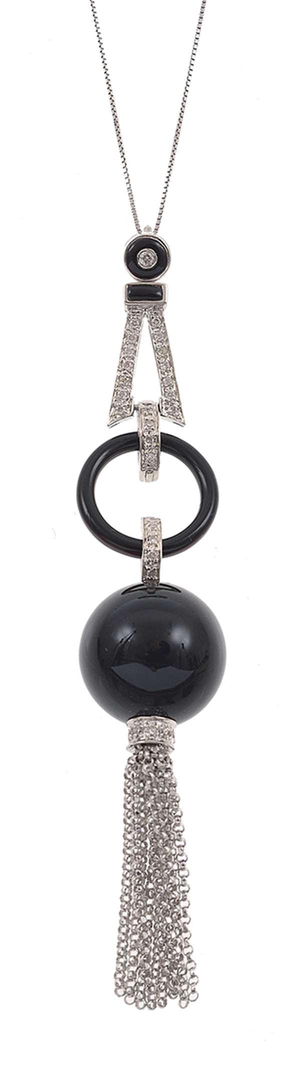 Of pierced geometric design set throughout with onyx and diamond and finished with an onyx ball with tassels, to a fine trace chain, all set in 18ct white gold, total length 450mm.