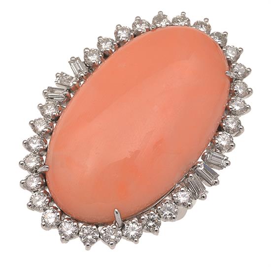 The large oval coral cut en cabochon surrounded by round brilliant and baguette cut diamonds, mounted in18ct white gold, ring size Q-R.