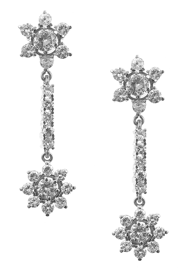 Each double floral drop set with round brilliant cut diamonds, in 18ct white gold.