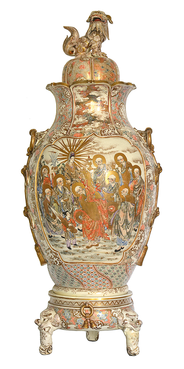 the main design of Buddhist arhats with side adornments of porcelain modelled ties in gilt gold and the base decorated with roundels, the lid decorated with a Shishi (Fo-Dog) finial, this vase would presumbly to be for display at one of the world exhibitions, the vase 90.5cm high, the base 18.8cm high