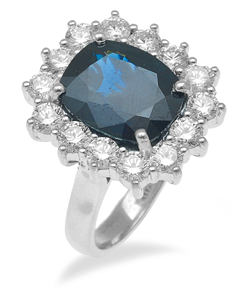 Centrally set with a cushion cut sapphire of 4.53cts, surrounded by round brilliant cut diamonds totalling 1.60cts, mounted in 18ct gold, ring size L.