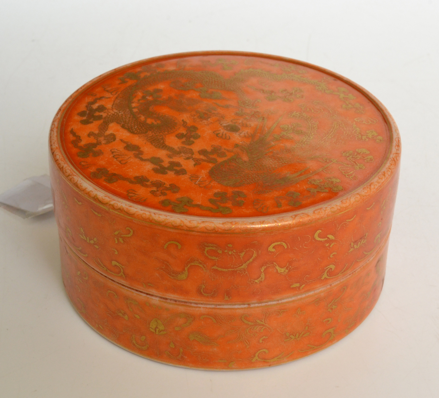 The circular form with gilt dragon and phoenix decoration on an orange ground, 10.5cm diameter and 5.5cm high.