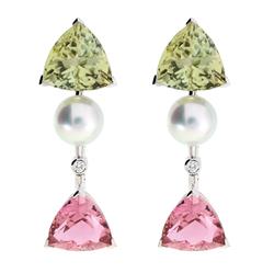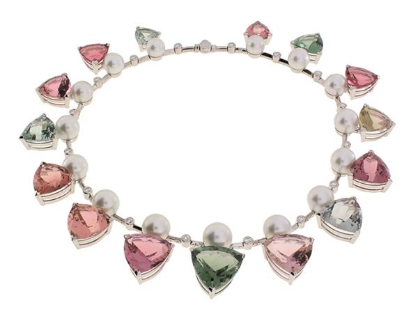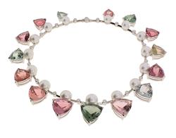 Comprising a necklace and earrings, each set with multi coloured trilliant cut tourmalines totalling 278.00cts, surmounted by pearls of silver white hue and fine lustre measuring 10.00mm to 12.00mm and interspaced by round brilliant cut diamonds, all in 18ct white gold.