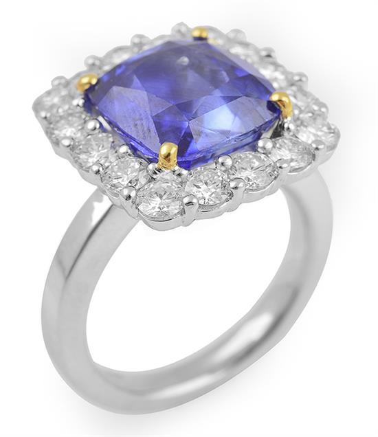 The cushion cut sapphire of 7.46cts, surrounded by round brilliant cut diamonds, mounted in 18ct white gold, ring size M.