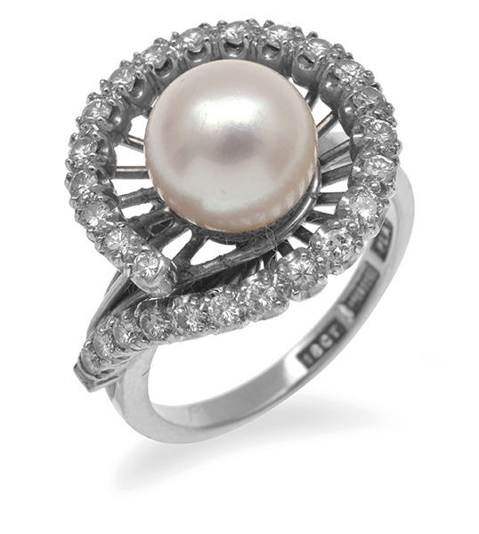 The cultured pearl set in a surround of round brilliant cut diamonds, mounted in 18ct gold and platinum, ring size M.