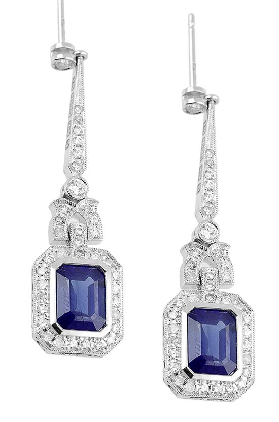 A PAIR OF ART DECO STYLE SAPPHIRE AND DIAMOND DROP EARRINGS