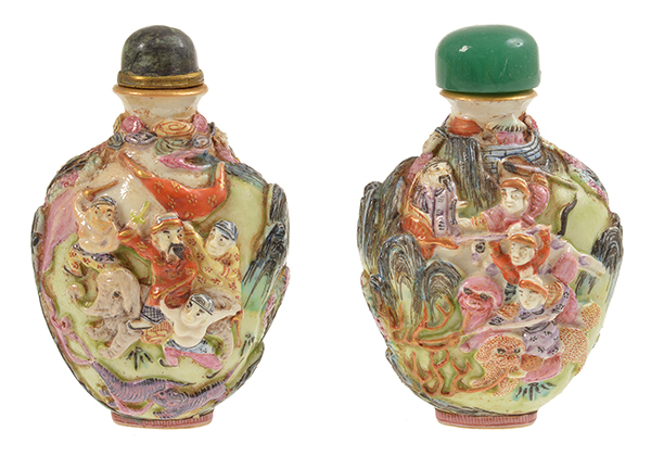 each ovoid in form resting on an oval base, moulded around the sides in high relief, the design in famille rose enamels, depicting continuous immortals scene, each 8cm high