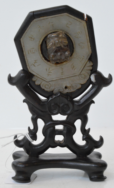 the octagonal jade plaque decorated with 12 Chinese symbols, mounted onto a wooden stand with a quartz guardian lion head to centre, 13cm high including stand