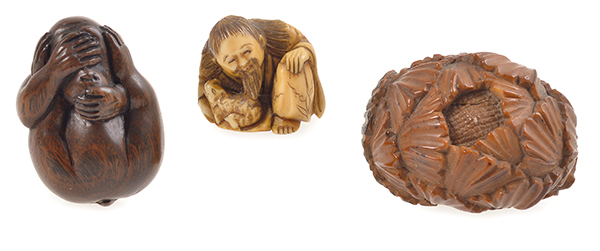 including a Meiji Period Rosewood stylised flower bud with signature of Oshu, a 20th Century Boxwood netsuke with monkey acting out the 'see no, speak no and hear no evil' proverb and a Meiji period Ivory Netsuke of Sage (sennin) with a frog, the tallest 4.3cm high