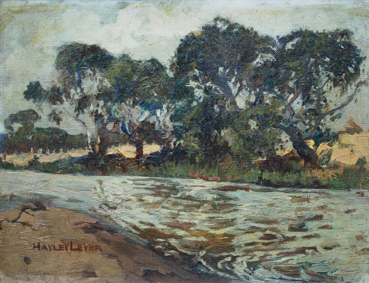 RICHARD HAYLEY LEVER (1876-1958), RIVERSIDE GUMS 1905, OIL ON CANVASBOARD, 25 X 32CM