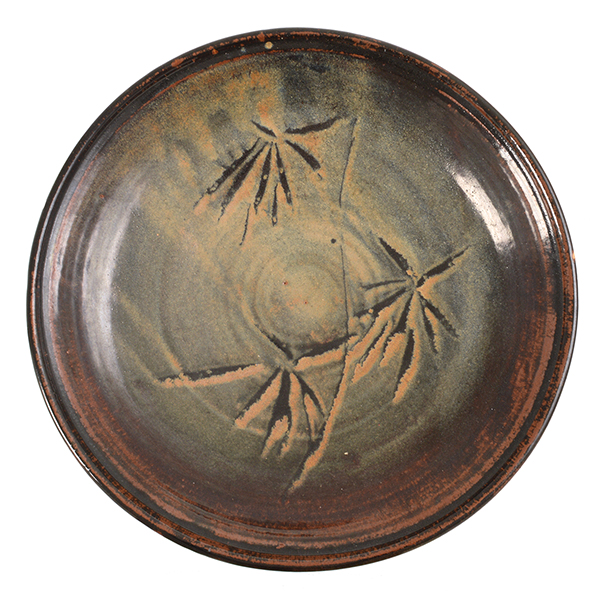 deep brown glaze with central leaf and branch motif under a pale blue and beige glaze, impressed mark to base, 49 diameter