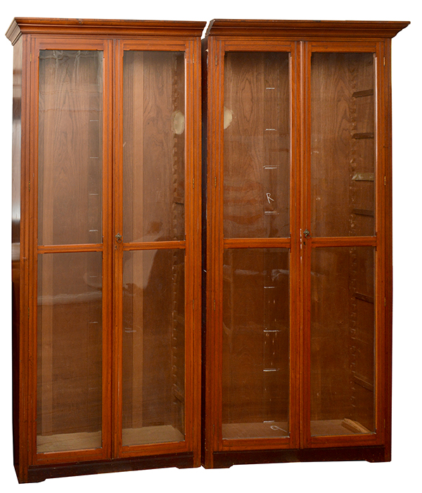 each with two glazed doors enclosing shelves, within reeded surrounds, 244 x 112.3 x 25cm